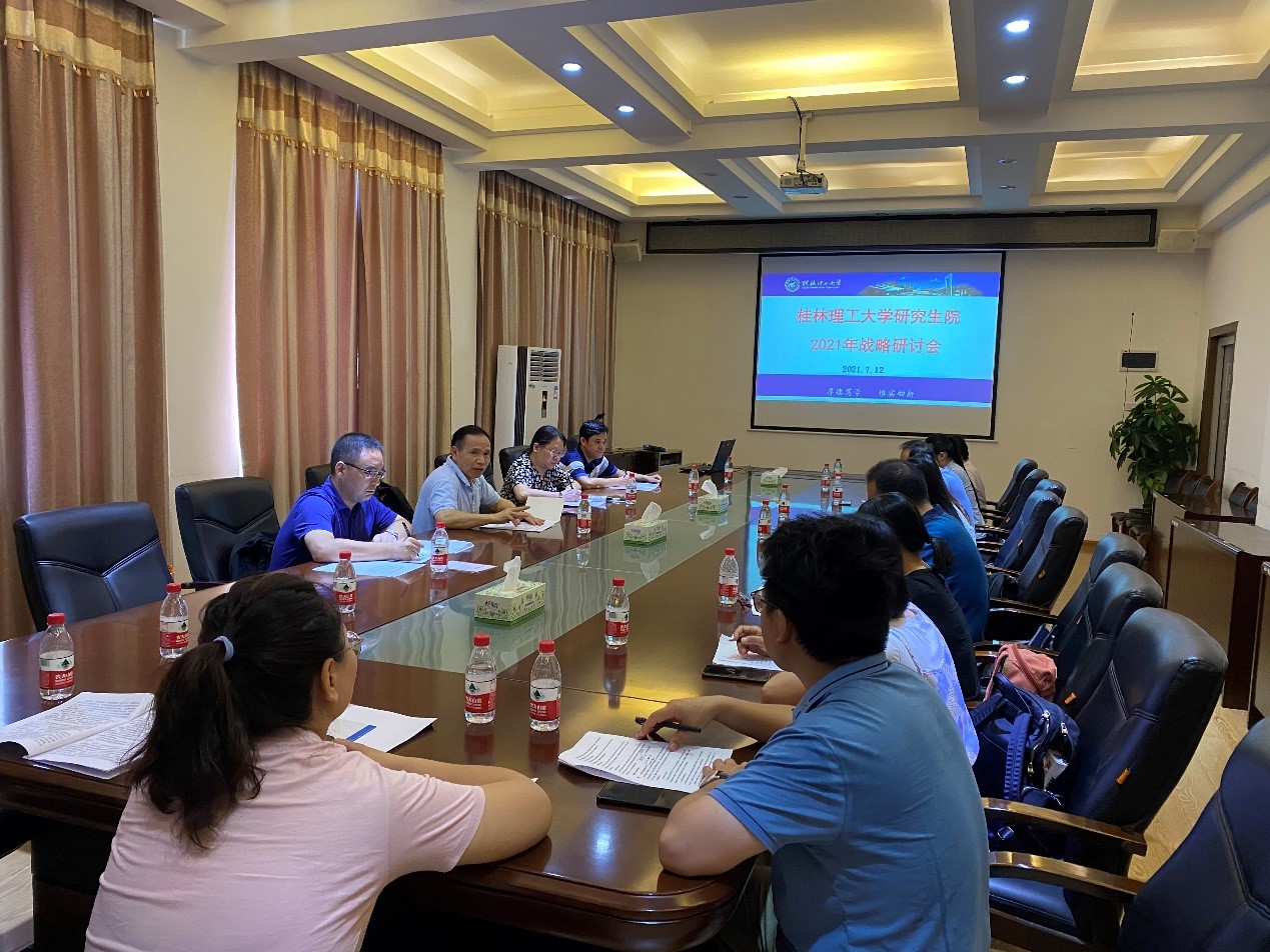 为深入学习贯彻习近平新时代中国特色社会主义思想,学习贯彻落实习近平总书记在庆祝中国共产党成立100周年大会上的重要讲话和视察广西时的重要讲话指示以及习近平总书记关于教育工作重要论述精神,推动学校“十四五”开局争先、起步加速,实现高质量发展,7月12日下午,研究生院在屏风校区教四楼会议室召开2021年战略研讨会。学校副校长周国清出席会议,研究生院全体人员参加。会议由副院长江玲主持。