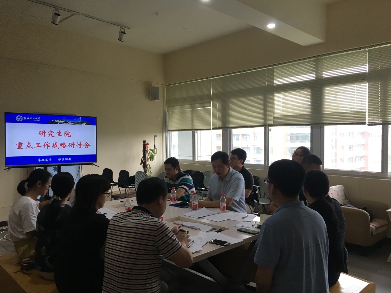 为落实和完成学校第三次党代会目标任务,落实和完成年度重点业务目标任务,7月8日上午,研究生院在雁山行知楼B608组织召开重点工作战略研讨会,研讨会由研究生院院长方亮主持,全体教职工参加。