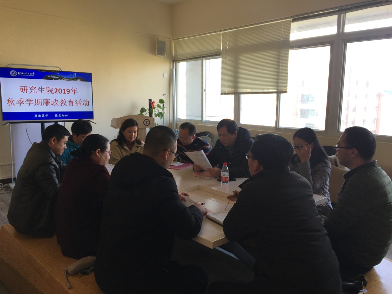 根据学校《关于组织开展2019年秋季学期 “廉政教育活动周”的通知》文件精神,为突出政治监督定位,确保主题教育做实,12月3日,研究生院在雁山行知楼B608召开秋季学期“廉政教育活动周”专题学习会,专题学习会由研究生院方亮院长主持,全体教职工参与。