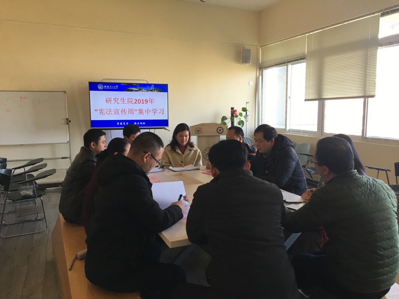根据学校《关于开展2019 年beats365(中国区)-唯一官方网站“宪法宣传周” 系列活动的通知》文件精神,为弘扬宪法精神,厚植爱国主义情怀,12月3日,研究生院在雁山行知楼B608召开“宪法宣传周”集中学习研讨会,学习研讨会由研究生院方亮院长主持,全体教职工参与。