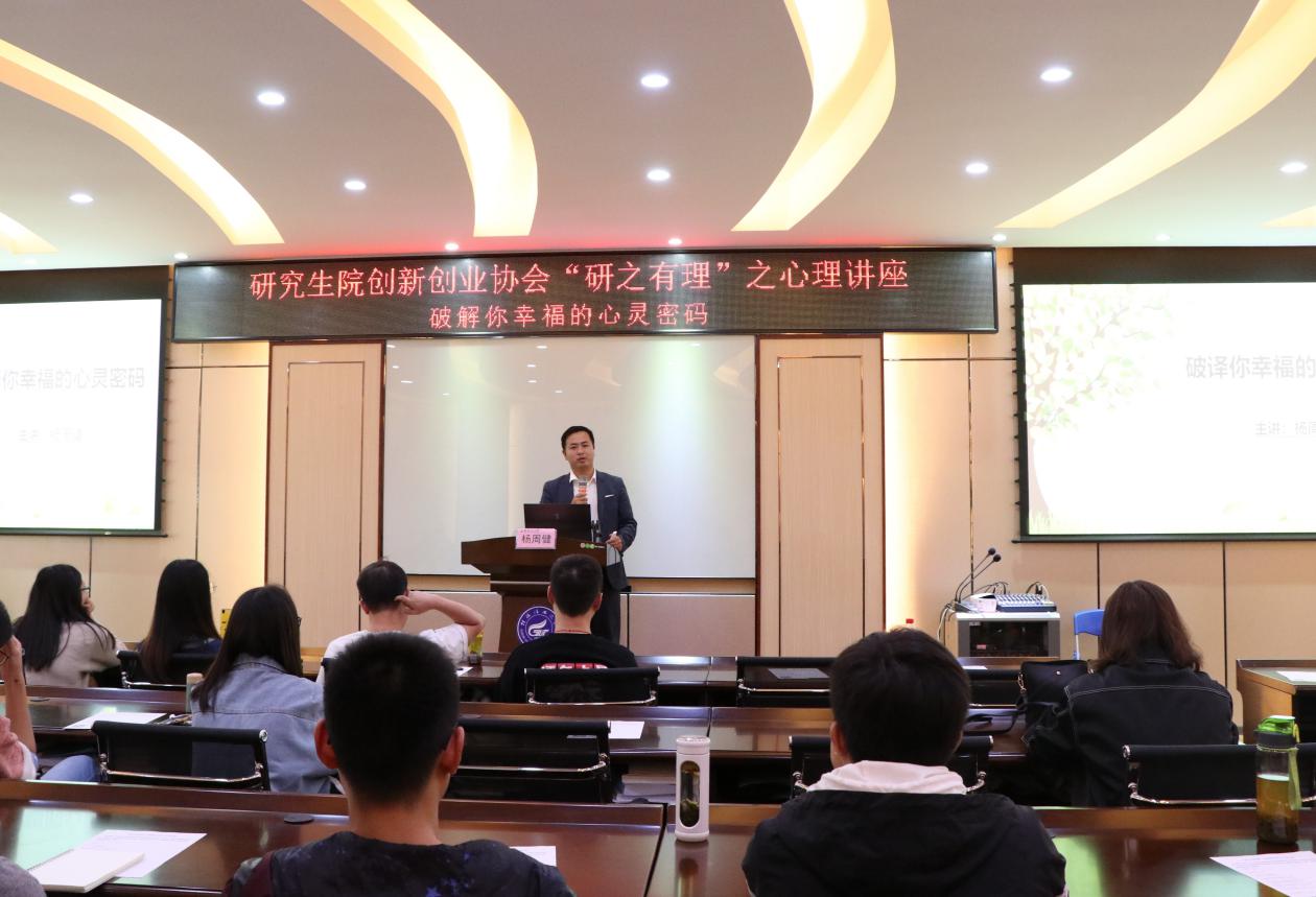 2019年11月14日下午,由研究生创新创业中心主办的“研之有理”主题沙龙活动,在我校屏风校区7106成功举行。本次活动邀请到了国家二级心理咨询师、我校心理健康教育与咨询中心的杨周建老师,为学生们讲述如何提升自身的幸福感。屏风校区各学院研究生同学参加。