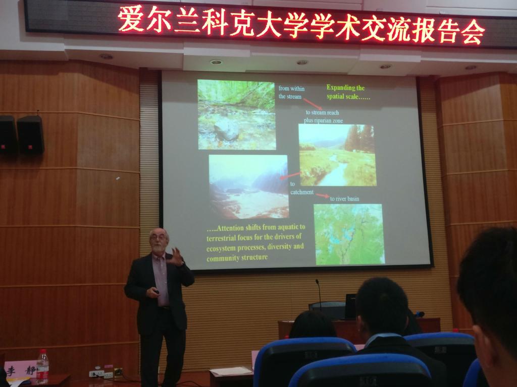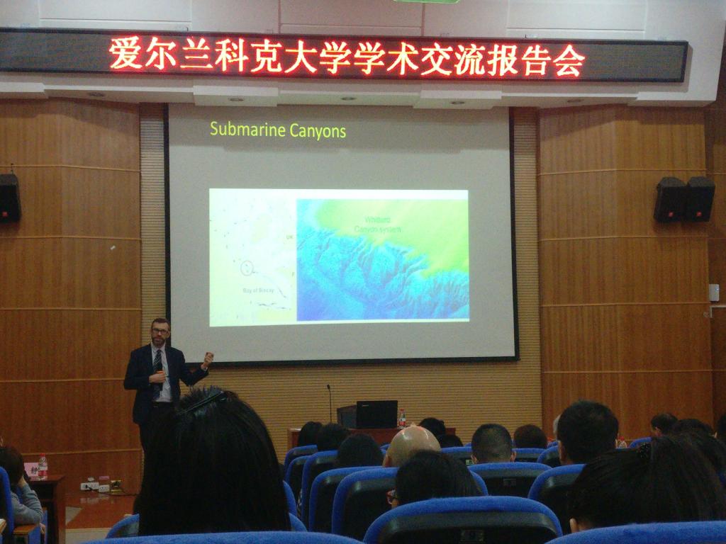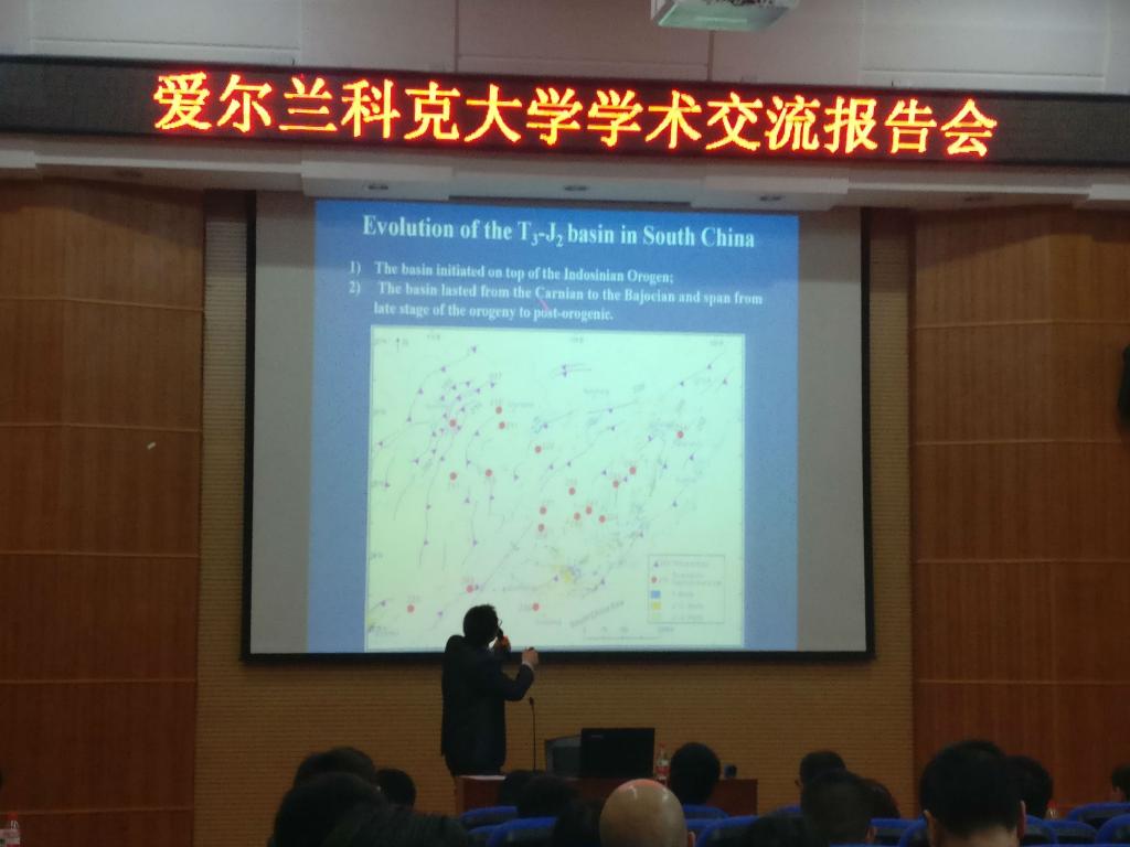 Paul S. Giller教授分享了自己在淡水生态系统、小溪和河流的四个维度方面上的研究进展。Paul S. Giller教授是一名生态学和动物学家,研究致力于生态、淡水生物学、生物多样性、生态系统功能等,是欧盟框架计划研究小组成员、英国国家环境研究委员会委员。Andrew Wheeler教授主要围绕着探索冷水珊瑚、珊瑚礁地质档案、潜艇峡谷的功能等几个方面介绍了自己在珊瑚礁研究方面上取得的科研成果。Andrew Wheeler教授是一位海洋地质学家,是科克大学生物地球与环境科学学院地质系主任、爱尔兰皇家科学院地质与地理委员会成员。我校地球学院庞崇进博士介绍了自己的研究课题,庞博士即将赴爱尔兰科克大学访学一年,地球学院李静和博士展示了复杂介质的频率域CSEM 2.5d快速成像相关研究课题。最后我校2015级环境学院博士研究生邹琦讲述了自己在爱尔兰科克大学访学期间的经验与心得,介绍了爱尔兰的教育体系、科克大学基本情况、爱尔兰文化节日和体育教学等等。