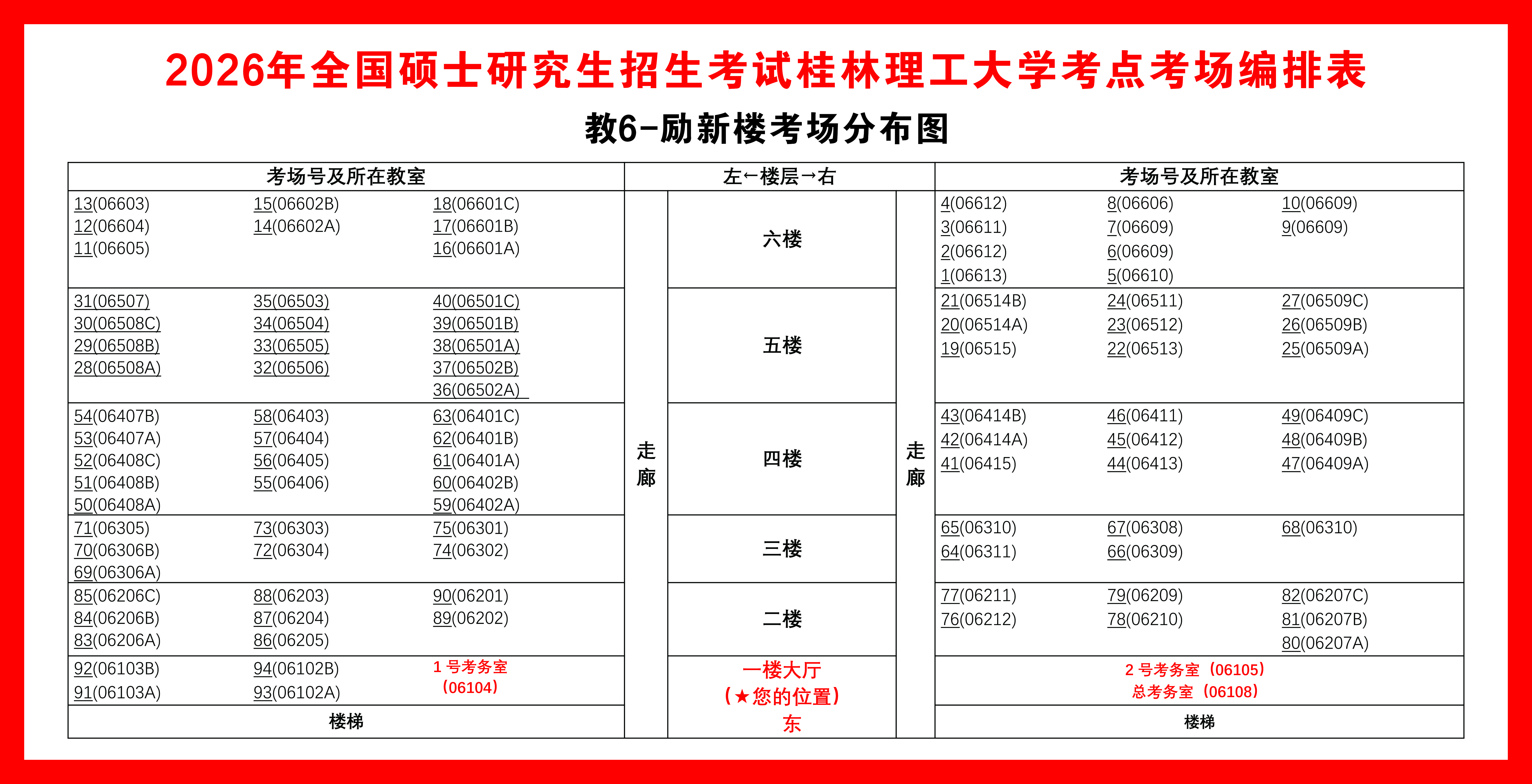 考点考场安排索引表、考点平面示意图、教6-励新楼考场分布图见附件。