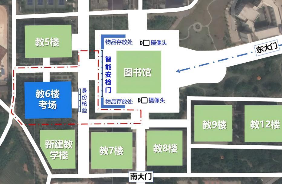 5.教6楼为考场封闭管理区域,考生必须通过“智能安检门”等入场安检环节方可进入。在进入考场封闭管理区域前,考生须将手机等非考试用品统一放在“智能安检门”旁的“非考试物品暂放处”。