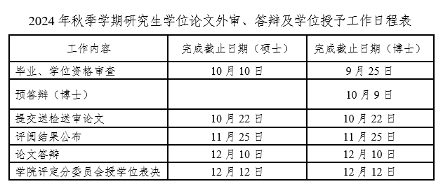 现将2024年秋季学期研究生学位论文外审、答辩及学位授予相关工作通知如下: