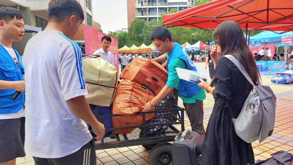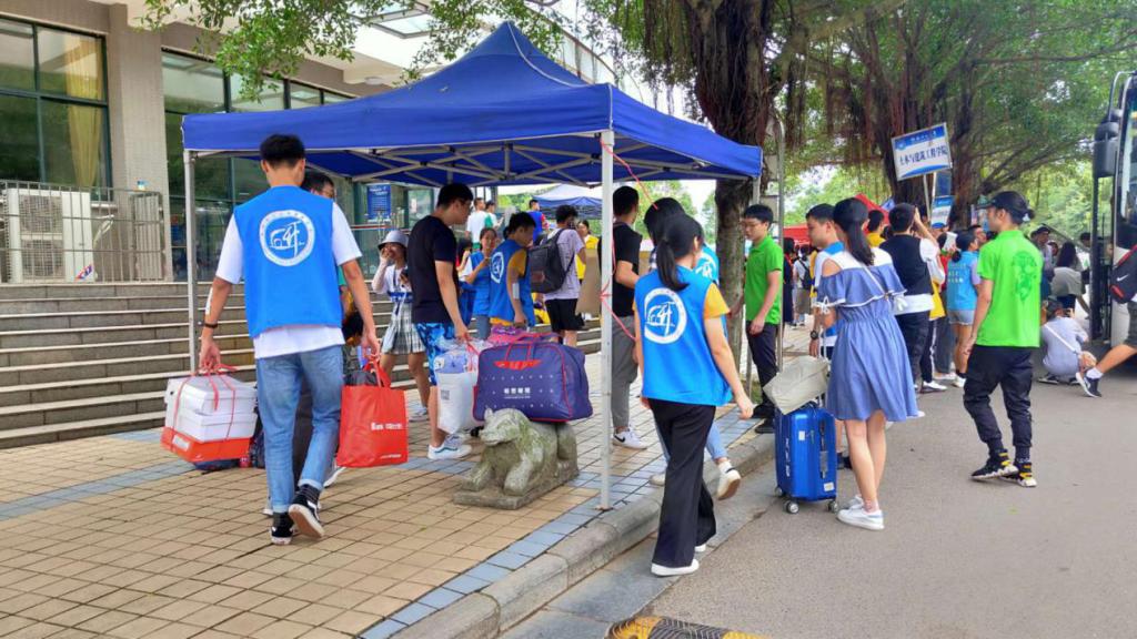 行李搬运强度大,齐心协力总能克服。按照疫情防控的要求,本次入校的新生提前14天居家观察,持绿码入校,家长不得入校,但我们在校外(桂林站、桂林北站等)、校内(屏风校区、雁山校区)均设置了对应的接待团,并在屏风校区研究生公寓门口,雁山校区2号组团门口设置研究生院大本营,帮助同学搬运行李,顺利办理入住。接待途中迎新志愿者一边拿着行李一边给新生介绍学校的基本情况,对于新生的问题和顾虑他们也是给予耐心的回答。新生住的楼层比较高,搬行李不方便,志愿者毫不犹豫,搬起行李在前带路。迎新志愿者给新生们留下了美好的印象,同时也为研究生院树立一个个良好的形象,让新学生们感受到学院对他们的重视和关怀。