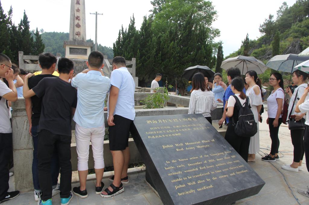 随后,同学们来到新圩阻击战酒海井红军纪念园,参瞻仰了酒海井纪念塔、红军烈士墓冢、红军烈士英名录和酒海井,了解了85年前发生在酒海井“120多名红军士兵被捆绑后沉井”悲壮的革命故事。同学们都被红军壮烈牺牲的事迹深深感动,认为革命胜利来之不易,应该不忘初心牢记使命,积极磨练本领增长才干,将来投入到社会主义建设中去。
