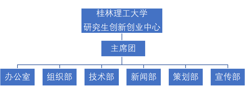 桂工研创以全校研究生为依托,本着与时俱进、勇于创新、开拓进取、铸造辉煌的理念,营造浓厚的学术氛围,提升研究生创新创业的素质与能力,既是面向研究生的服务机构,又联结研究生和社会的桥梁与纽带。其采用“主席团+工作部门”模式,主席团设立主席1人,副主席2人。下设6个工作部门:办公室、组织部、技术部、新闻部、策划部、宣传部,各部门设置部长1名。