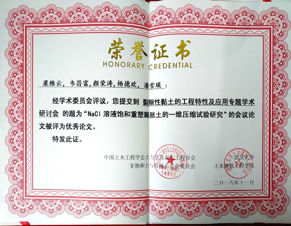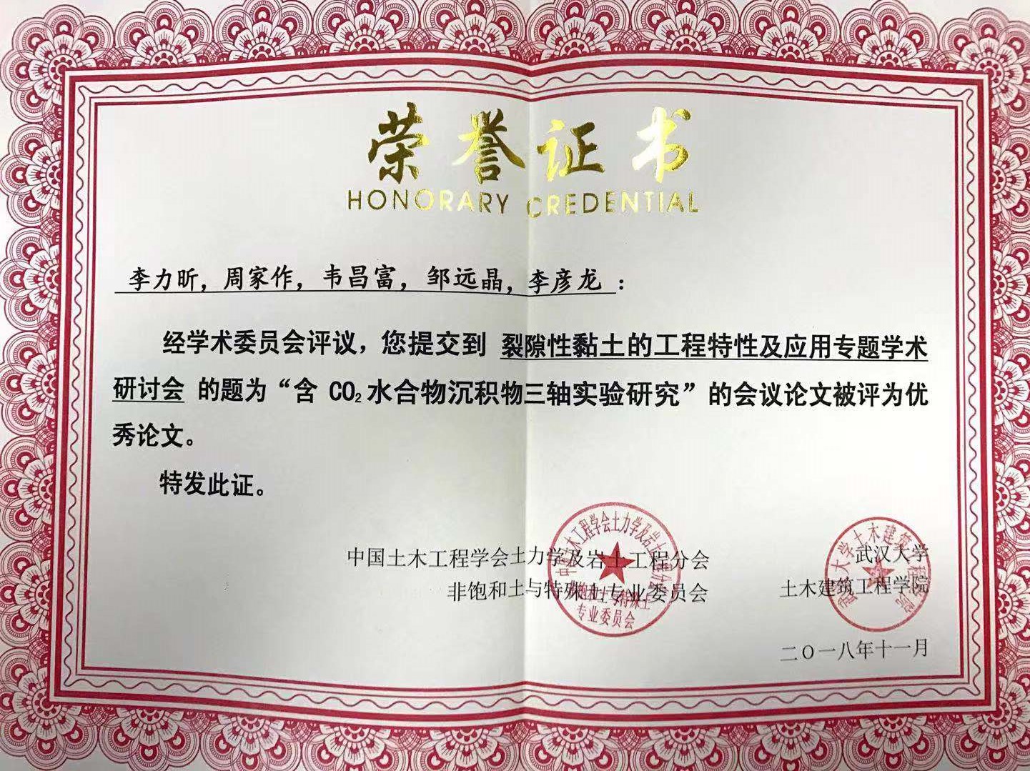 2018年11月2日至4日,我校研究生梁维云、李力昕提交的论文被“裂隙性黏土的工程特性及应用专题学术研讨会”大会学术委员会评为“优秀论文”。本次会议收到学术论文86篇,评选出9篇优秀论文。我校博士研究生梁维云关于宁明膨胀土孔隙水化学状态对土体压缩特性与微观孔隙结构的影响规律的研究,硕士研究生李力昕关于水合物对赋存介质的强度与变形特性的影响机理的研究,这两项成果获得与会专家的一致好评。