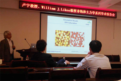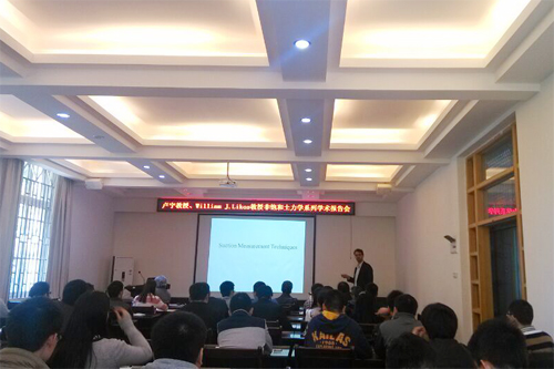 4月13日, William J.Likos教授作了关于Suction Measurement (吸力测量)的学术报告,给师生们详细讲解了Overview of measurement techniques、Tensiometer、Axis translation、Electrical/Thermal等科研内容;4月14日,卢宁教授为师生们深入阐述了Hydraulic Conductivity Measurement (渗透系数测量)中Overview of measurement techniques、Steady-state measurement techniques、Transient measurement techniques、Drying cake measurement technique、TRIM measurement system等知识和技术;4月15日,William J.Likos教授再次为师生们作了关于Suction and Hydraulic Modeling (吸力与渗透系数模型)的学术报告,对Soil-water characteristic curve models、Hydraulic conductivity models等研究领域进行了具体介绍;最后,进行了学术交流研讨会,就Unsaturated soil at the pore scale、Soil-water retention等科研问题,和现场的师生们进行热烈且富有成效的学术交流。