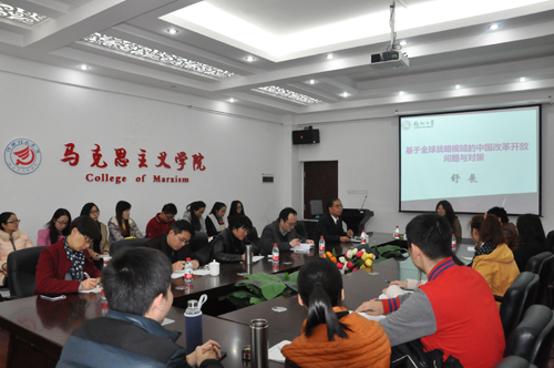 舒展教授从中国改革开放以来经济上取得的一系列变化入手,充分肯定了改革开放的喜人成果,对改革开放初期形成的战略思路进行了分析,深刻总结了我国农村未能全面实现现代化的原因,并指出十八届三中全会提出全面深化改革的原因。随后,舒展教授用“一个真相、两个缘由、三个事实”总结出经济全球化的实质是资本主义霸权的全球化,从货币、黄金、外汇储备用途三方面提出了深化改革开放和应对资本主义霸权的对策。报告会后,舒展教授就师生提出的问题做了回答和讨论。