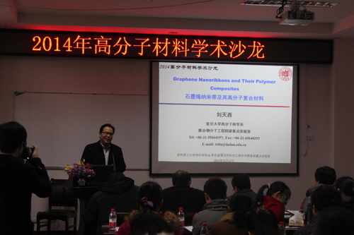 然后,共有14名师生在会上作学术报告。报告包括:石墨烯纳米带及其高分子复合材料(刘天西教授);静电纺聚酰亚胺纳米纤维隔膜在锂离子电池中的应用(缪月娥博士);球磨法制备氧化石墨烯及其结构与性能研究(付俊硕士);石墨烯基中空杂化材料在超级电容器中的应用(樊玮博士);剑麻纸浆增强酚醛树脂复合材料的机械性能及微观形貌研究(王世其硕士);多层硫化钼纳米片负载于氧化锡纳米管用于高效电析氢催化剂(黄云鹏博士);利用非共价键功能化的石墨烯改性环氧树脂的热学及力学性能(曾岑硕士);石墨烯/聚酰亚胺气凝胶基碳气凝胶的制备及电容性能研究(张由芳博士);基于超支化聚缩水甘油醚的有机无机纳米材料研究(周立教授);超支化聚芳酰胺接枝微晶纤维素纤维/环氧复合材料的制备及其热性能、力学性能研究(肖仙娥硕士);一步法制备氮掺杂石墨烯/碳纳米管/四氧化三钴杂化材料用于高效氧还原催化剂(鲁恒毅博士);PolyHIPE块体受限空间内部MMA的反向原子转移自由基聚合(孙发孟硕士);多孔二硫化钼纳米片/石墨烯杂化材料在锂离子电池负极材料中的应用(张龙生硕士);PolyHIPE块体孔道内双环戊二烯/苯乙烯的聚合反应(许旺发硕士)。
